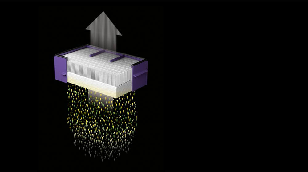 The HEPA filter removes airborne particles from the air. It has a grille to capture larger debris, a fleece layer to capture fluff and fibres, and a pleated HEPA media to capture paricles as small as 0.3 microns.1